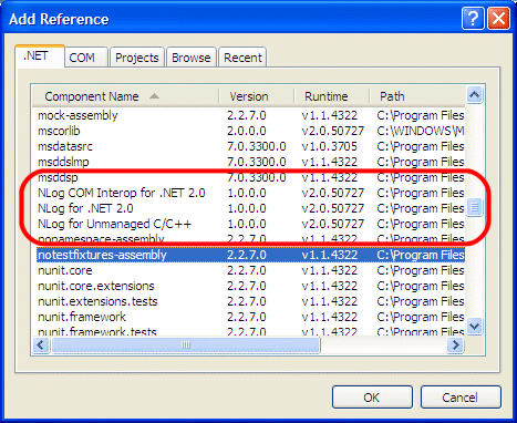 NLog的安裝程序會(huì)把NLog的動(dòng)態(tài)鏈接庫(kù)信息注冊(cè)到Visual Studio的相關(guān)注冊(cè)表項(xiàng)目中,這樣在Visual Studio的添加參照的對(duì)話框中我們就能夠找到NLog的幾個(gè)動(dòng)態(tài)鏈接庫(kù)。Visual Studio的所有版本都可以使用這一功能。