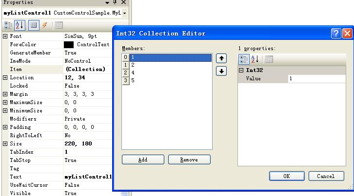 在這個(gè)控件中,我聲明了一個(gè)集合屬性Item供用戶輸入要顯示的整型數(shù)值。我們按照WinForm控件制作教程(二)中的方法將控件加到ToolBox里,然后拖到Form設(shè)計(jì)器中,然后選中控件,在屬性瀏覽中查看控件的屬性,屬性中有一個(gè)Item的屬性,屬性右邊的值顯示為Collection,當(dāng)你點(diǎn)擊這個(gè)值的時(shí)候,值的右邊出現(xiàn)一個(gè)小按鈕,點(diǎn)擊這個(gè)小按鈕,就會(huì)出現(xiàn)彈出一個(gè)Collection Editor窗口,你可以在在這個(gè)編輯器里添加你想顯示的整型值,如圖: