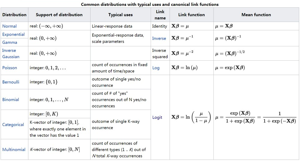 | Probit回歸(Probit Regression) | 二項分布 | 普通正態函數 \(g(\mu) = \Phi^{-1}(\mu)\) | 二分類問題,類似邏輯回歸,常用于金融、醫學等領域 |