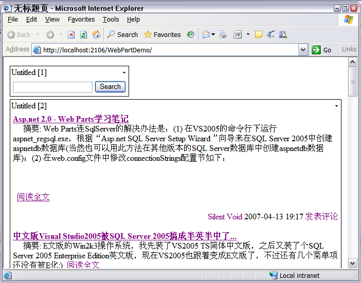 我在學習過程中,通過實例--根據我的Blog的RSS來搜索文章--來演示Web Part之間的靜態通訊。運行結果如下所示(沒有進行界面美化^_^):