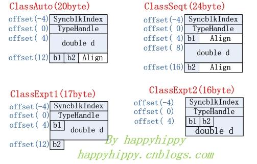 對于在引用類型上應用默認的[StructLayout(LayoutKind.Auto)]特性情況,CLR應該會將兩個bool型變量b1和b2放到相鄰的位置中,因此ClassAuto的size應該是4(SyncblkIndex)+4(TypeHandle)+8(double d) + 1(bool b1) + 1(bool b2) + 2(4byte內存對齊)=20byte;