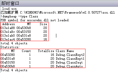 編譯上面的代碼,在Main函數的“return;”語句處設置斷點,按F5進入Debug調試模式,程序運行到斷點處中止;然后我們通過“菜單->Debug->Windows->Immediate”打開“Immediate Window”,在該窗口中先輸入“.load sos”來啟用非托管代碼調試,提示已加載SOS.dll擴展后再輸入“!DumpHeap -type Class”,此時會輸出當前進程中類名中包含“Class”字符串的所有對象的信息,如下圖所示:
