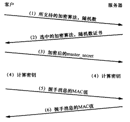 第5與第6步對應(yīng)Finished消息。該消息是第一條使用剛剛磋商過的算法加以保護(hù)的消息。為了防止握手過程遭到篡改,該消息的內(nèi)容是前一階段所有握手消息的MAC值。然而,由于Finished消息是以磋商好的算法加以保護(hù)的,所以也要與新磋商的MAC密鑰—起計算消息本身的MAc值。