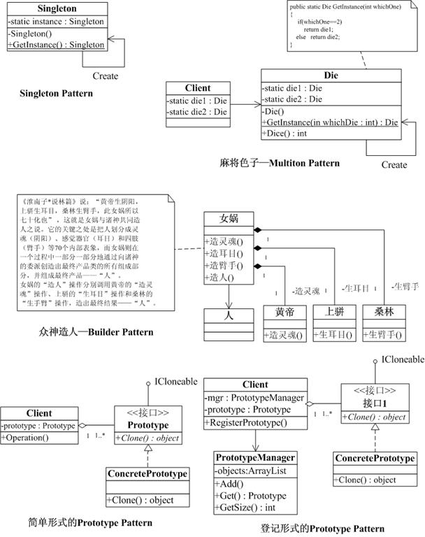 Simple Factory Pattern, Factory Method Pattern, Abstract Factory Pattern, Singleton pattern, Mutition Pattern, Builder Pattern, Prototype Pattern