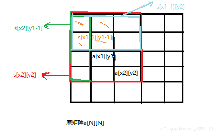 設置前綴和數組為: \(sum_{i,j}=\sum_{u=1}^i \sum_{v=1}^j A_{u,v}\)