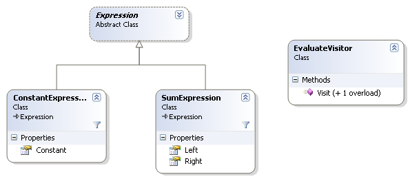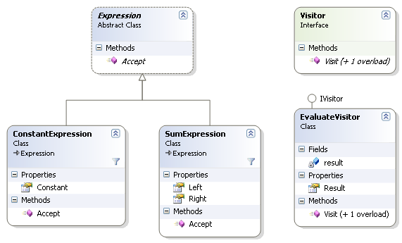 可以看出這張圖和前者相比,復雜了許多。但是只有這樣我們才能在C#這種不直接支持Double Dispatch的語言中實現Visitor模式。