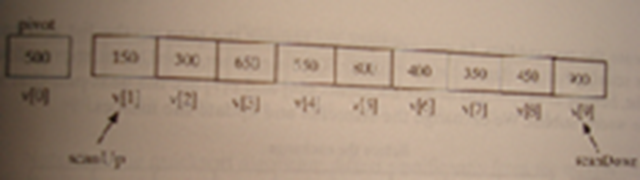 ,在交換v[3](650>500)與v[8](450<500)后,繼續(xù)掃描左子表和右子表,如圖(