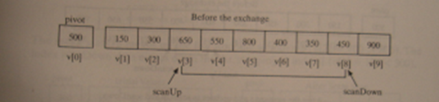 ,而此時(shí)的左子表掃描位置處于索引1處,右子表掃描位置處于索引9處,先從左子表掃描,直到找到數(shù)據(jù)值大于中間值500的位置停止掃描,然后掃描右子表,直到找到數(shù)據(jù)值小于中間值500并且右子表的掃描位置(scanDown)要小于左子表開始位置,防止數(shù)據(jù)溢出。找到之后,交換左子表與右子表中中掃描位置的元素,圖示如下: