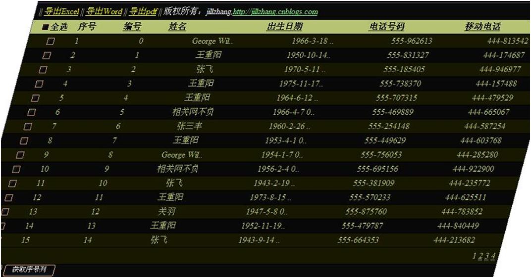 功能介紹 :無亂碼導出excel,word與pdf,只需要簡單的設置即可出現工具條,點擊工具欄中按鈕可導出到上述文件,配置靈活,簡單易用,支持列刷選,加入了pdf格式