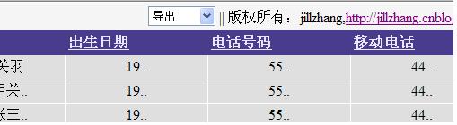 使用方法 :使用該功能無需添加任何代碼,只需要在設計視圖中設置即可。步驟如下:打開GridView的屬性窗口,找到"jillzhang擴展"類別? 在該類別下找到ExportBehavior屬性設置,如果想顯示或者隱藏工具欄設置Visible(true/false),工具欄可見之后,您可以單獨設置導出word,excel,pdf和顯示版權信息,默認顯示版權信息,如果您應用于生產,可設置ShowCopyRight="false"。工具欄中每個按鈕之間的間隔可以設置Sepeator來更改,其中通過ToolBoxStyle可以設置工具欄行的樣式,比較靈活。