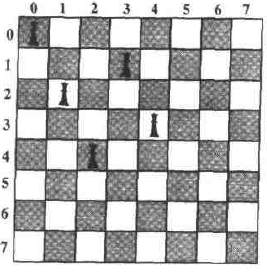 在8*8國際象棋棋盤上,要求在每一行放置一個皇后,且能做到在豎方向,斜方向都沒有沖突。國際象棋的棋盤如下圖所示: