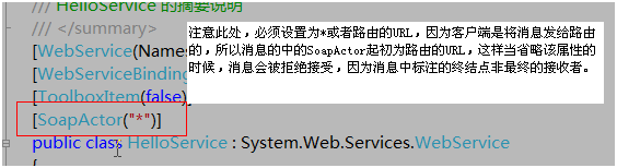 網絡服務:使用了路由的網絡服務必須接受來源于路由服務器R的請求,因此需指定網絡服務的SoapActor Attribute,為路由的URL或者接受所有的來源。有關SoapActor的描述如下:一個SOAP消息從始節點到終節點的過程中,可能沿著消息路徑經過一系列SOAP中間節點。一個SOAP中間節點是一個可以接收轉發SOAP消息的應用程序。中間節點和終節點由URI區分。可能SOAP消息的終節點并不需要所有部分,而在消息路徑上的一個和幾個中間節點可能需要這些內容。頭元素的接收者扮演的角色類似于一個過濾器,防止這些只發給本接受者的消息部分擴散到其它節點。即一個頭元素的接收者必須不轉發這些頭元素到SOAP消息路徑上的下一個應用程序。同樣的,接收者可能插入一個相似的頭元素。SOAP actor全局屬性可以用于指示頭元素的接收者。SOAP actor屬性的值是一個URI。省略SOAP actor屬性表示接收者是SOAP消息的終節點