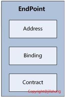 在弄清Binding是什么之前,我們先看一下WCF的中的Endpoint結構,一個Endpoint就類似于xml web service中的一個asmx文件,它包括三個組成部分1)Address 2) Binding 3) Contract,此三者被稱為組成Endpoint的"ABC",下圖闡述了Endpoint的組成結構: