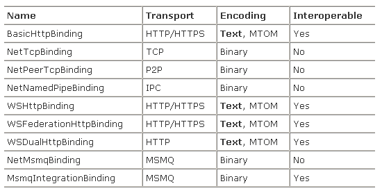 Binding是可以自定義實現的,可WCF框架已經為我們實現了足夠多的Binding,供我們來選擇,如下表所示: