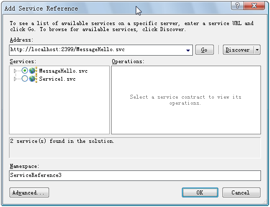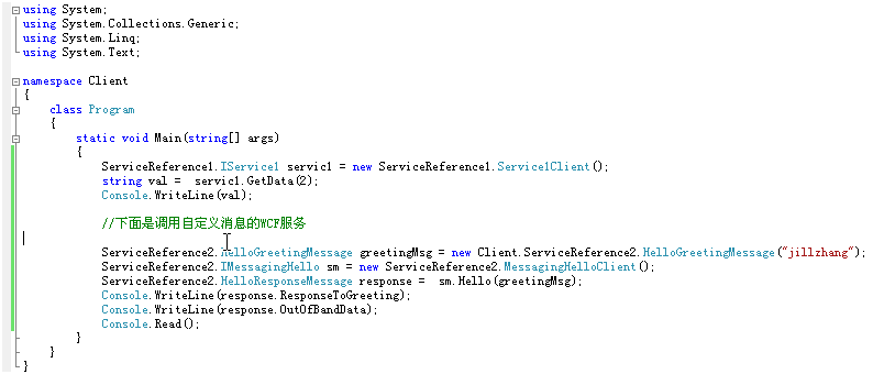 分別添加對MessageHello.svc和Service1.svc的引用后,在programe.cs中添加如下代碼: