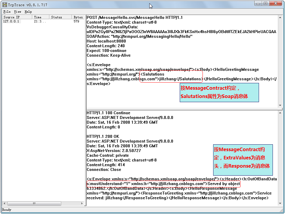 有關(guān)如何用tcpTrace監(jiān)視消息報文,參見:http://www.rzrgm.cn/artech/archive/2007/06/14/782845.html