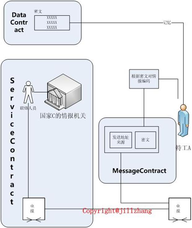 協(xié)定定義消息系統(tǒng)的各個方面。包括Data Contract(數(shù)據(jù)協(xié)定),Message Contract(消息協(xié)定) ,Service Contract(服務(wù)協(xié)定)。Data Contract是WCF中 Service與Client端之間用來交換的數(shù)據(jù)的格式定義,它采用Xml 架構(gòu)定義語言(XSD)來定義,使得服務(wù)端和客戶端都能理解數(shù)據(jù)格式定義。消息協(xié)定能定義消息的特定部分,默認(rèn)情況下 ,WCF的消息是由固定格式的,但某些情況下,也可以使用Message Contrace來自定義消息格式。服務(wù)協(xié)定指定服務(wù)端公開的方法簽名,這些方法能夠在遠(yuǎn)程被調(diào)用。舉個國家和間諜的例子,A 是國家C派往其它國家的一名間諜,他負(fù)責(zé)收集情報,被通過某種特定的渠道,將獲得的情報發(fā)送給國家C,假如A在出去執(zhí)行任務(wù)之前,國家C的特工部門為其編訂了一套密文,這個密文只有國家C和特工部門和A知道具體含義,這些密文正是在A與其國家之間進(jìn)行傳遞的數(shù)據(jù),國家C對密文的制定,正是WCF中對交換數(shù)據(jù)格式的定義,屬于Data Contract范疇,而A在獲得情報之后,通過電報的方式將情報發(fā)回給國家情報機(jī)關(guān),它首先設(shè)置電報的發(fā)送地址并注明來源,并且將情報信息編碼成密文進(jìn)行發(fā)送,對電報報文的格式定義就屬于Message Contract范疇,而國家情報機(jī)關(guān)為A要想接受和對A發(fā)送任務(wù)命令,必須也提供固定的通訊設(shè)施和人,這些能夠被A所聯(lián)絡(luò)上的通訊設(shè)施和人就屬于Service Contract的范疇。
