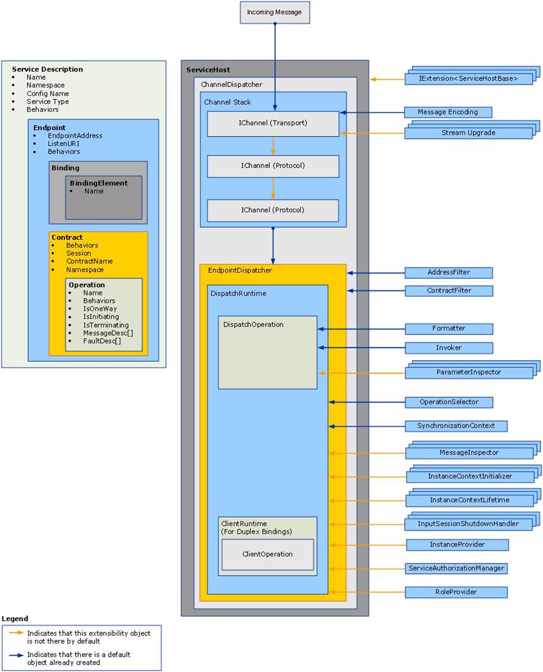 上面說的協(xié)定是在開發(fā)wcf服務(wù)時候制定的,而服務(wù)運(yùn)行時,是在服務(wù)實際運(yùn)行時候地一些行為控制。ErrorBehavior是在服務(wù)出現(xiàn)錯誤的時候發(fā)生的操作,ThrottingBehavior能夠限制創(chuàng)建多少個實例和會話,通過這個您能夠控制WCF服務(wù)的性能,MetaBehavior(元數(shù)據(jù)行為)控制是否和如何向外部提供元數(shù)據(jù)。TransactionBehavior能定義事務(wù)性,使得當(dāng)發(fā)生異常的時候能進(jìn)行回滾。DispatchBehavior(調(diào)度行為)能控制WCF處理消息的方式,通過擴(kuò)展性功能可以自定義運(yùn)行時進(jìn)程。 例如,消息檢查功能用于檢查消息的各個部分,使用參數(shù)篩選功能可以根據(jù)作用于消息頭的篩選器來執(zhí)行預(yù)設(shè)操作。下圖顯示了WCF的消息處理流程