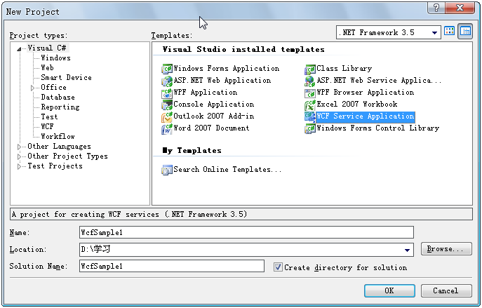 打開vs2008,創(chuàng)建一個Wcf Application,命名為WcfSample1 ,如下圖所示:
