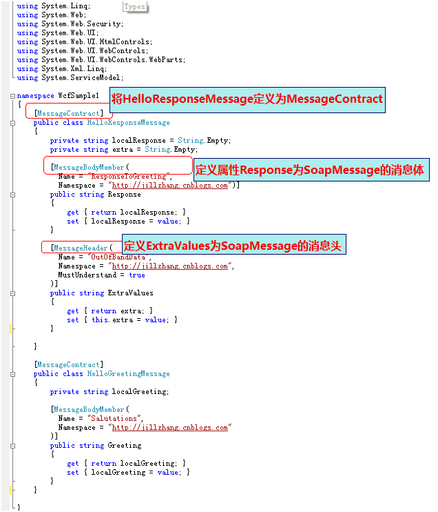 為了簡單的闡述MessageContract,我們新建一個CustomMessage.cs,代碼如下: