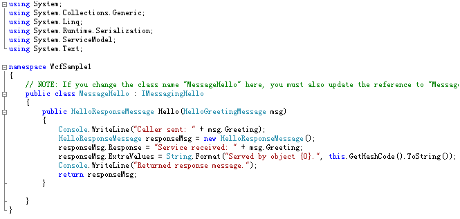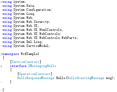 為使用該服務(wù),我們再創(chuàng)建一個ServiceContract接口和其具體實現(xiàn),分別為:IMessagingHello.cs和MessageHello.svc