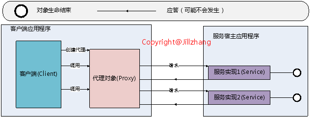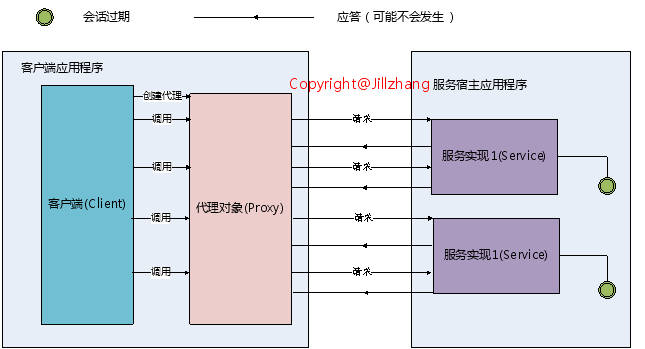- 在執行完請求操作后,如果要求有應答,那么服務契約會給代理對象一個應答,然后銷毀自己(如果實現了IDisposable,則調用Dispose())。