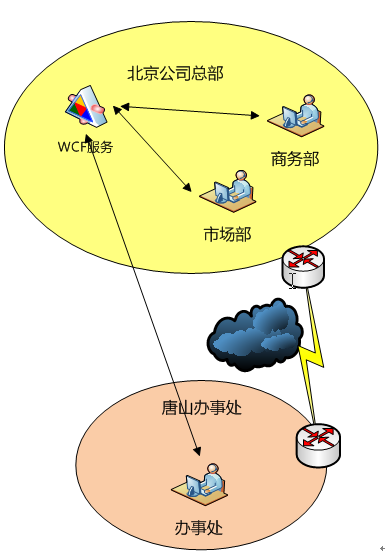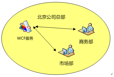 小王效力于北京的一家系統集成公司,該公司內部有一個WCF服務為各個部門所共用,小王便是WCF服務的開發和維護人員。起初大家在一個辦公樓工作,共用一個局域網,WCF運行的非常好,小王也因此獲得了公司上下的一致好評。此時他們的WCF的使用狀態如下圖所示: