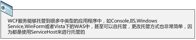 不僅如此,在不同宿主中寄宿的方法也一致:都是采用ServiceHost來進行托管。知道上面的知識,小王將原本Console宿主中 的托管代碼拷貝到Windows服務的代碼中,只不過,Console中托管代碼寫在Main方法,而Windows Service寫在OnStart方法中。