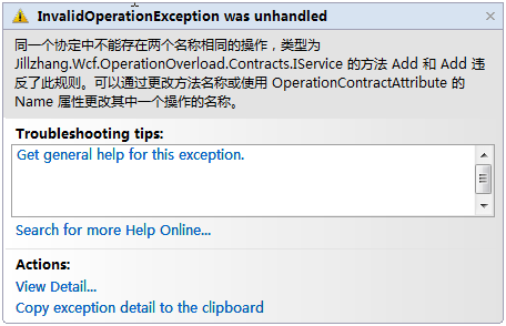 這個(gè)異常提示我們,同一個(gè)協(xié)定之中不能存在相同的操作,在WCF中操作重載是不顯示適用的。而且問(wèn)題不在于編譯階段,而在于托管階段。