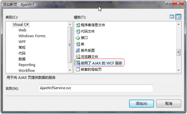 第二步: 創(chuàng)建一個可用于ajax交互的wcf服務(wù)AjaxWcfService.svc,方式如下: