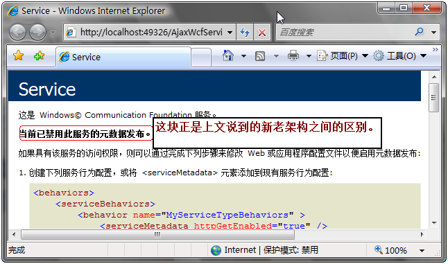在瀏覽器中瀏覽AjaxWcfService.svc,會出現(xiàn)下面的效果: