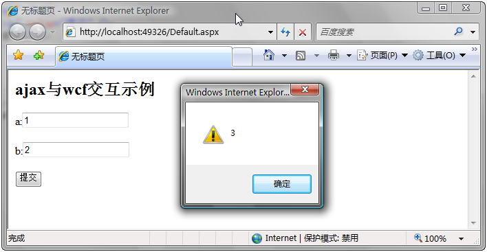 第六步: 好,現(xiàn)在萬事俱備,只欠測試了,在瀏覽器中瀏覽default.aspx,隨便在輸入框中輸入連個數(shù)字,點擊提交,結(jié)果如下:
