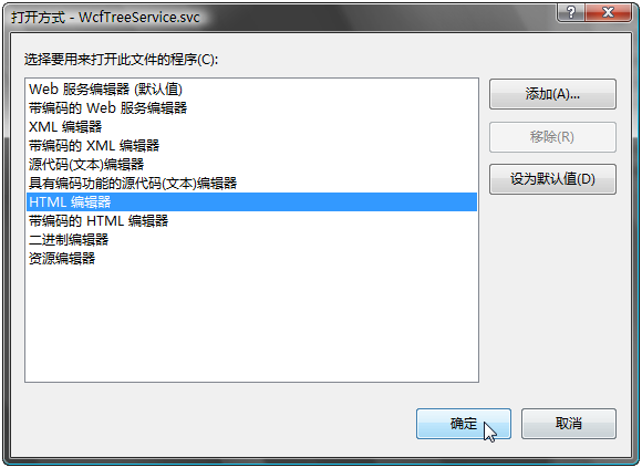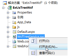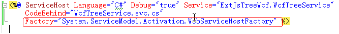 1)在WcfTreeService.svc中增加Factory="System.ServiceModel.Activation.WebServiceHostFactory",打開WcfTreeService.Svchtml編輯器的方法如下: