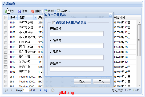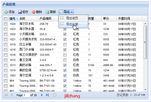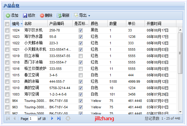 //創建可編輯Grid對象 var grid = new App.JillzhangGrid({ svcUrl:'service/PageGridService.svc', sortInfo:{field: "ProductID", direction: "DESC"}, dataKey:'ProductID', dataFields:product, pageSize:25, gridFormEl:'form1', gridFormFiled:'data', addPanel:addForm, renderTo:'page-grid', cm:cm, sm:sm2, //設置Name列為大小自適應 autoExpandColumn: 'Name', height:400, width:600, //自定義控件 plugins:[checkColumn,filters], title:'產品信息' });