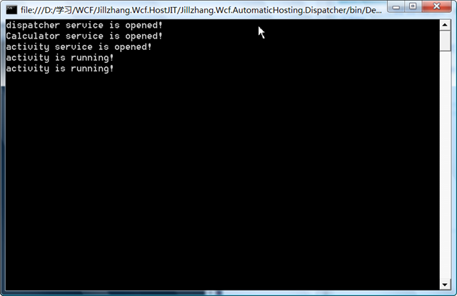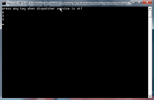 using System; using System.Collections.Generic; using System.Linq; using System.Text; using System.ServiceModel; using Jillzhang.Wcf.HostJIT.Contracts; namespace Jillzhang.Wcf.HostJIT.Client { class Program { static void Main(string[] args) { Console.WriteLine("press any key when dispatcher service is ok!"); Console.Read(); CallCalculator(); CallActivity(); CallCalculator(); CallActivity(); Console.ReadKey(true); } static void CallCalculator() { using (ChannelFactory<ICalculator> channelFactory = new ChannelFactory<ICalculator>("Calculator")) { var channel = channelFactory.CreateChannel(); using (channel as IDisposable) { Console.WriteLine(channel.Add(1, 2).ToString()); } } } static void CallActivity() { using (ChannelFactory<IActivity> channelFactory2 = new ChannelFactory<IActivity>("Activity")) { var channel = channelFactory2.CreateChannel(); using (channel as IDisposable) { channel.Excute(); } } } } } 好了,在解決方案中設置多啟動項目,啟動Jillzhang.Wcf.HostJIT.Client和Jillzhang.Wcf.HostJIT.Dispatcher,f5,然后按照提示進行輸入
