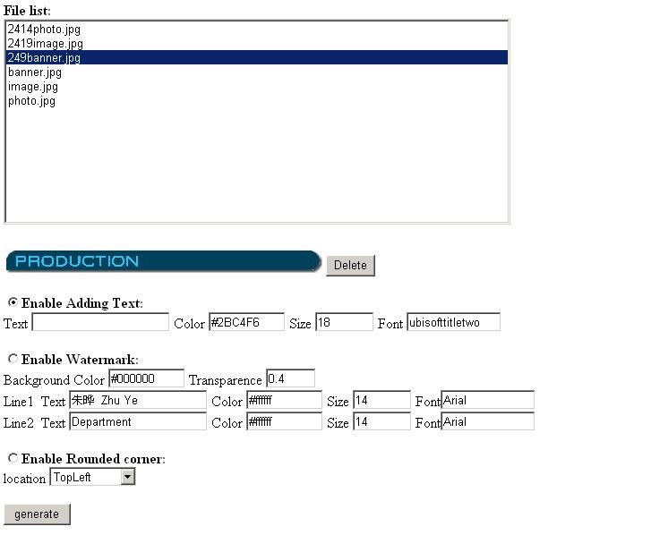 public static void CreateWatermark(string sSrcFilePath, string sDstFilePath, string sText1, string sColor1, string sSize1, string sFont1, string sText2, string sColor2, string sSize2, string sFont2, string sBgColor, string sTransparence)