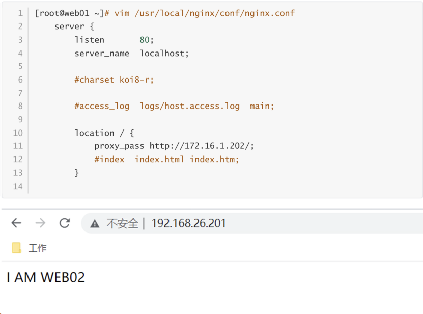 web1機(jī)器的配置:對(duì)于物理機(jī)來(lái)講,是沒(méi)有辦法直接訪問(wèn)到172.16.1.202這個(gè)地址的,可以使用反向代 理的方式訪問(wèn),通過(guò)web01配置反向代理,把請(qǐng)求代理給web02機(jī)器。