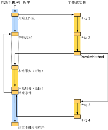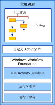 下面的插圖顯示了如何在一個宿主應用程序的進程中同時承載工作流、活動和工作流運行時引擎。