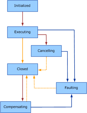 紅色實線表示工作流運行時引擎負責將活動從 Initialized 狀態轉換到 Executing 狀態,或從 Closed 狀態轉換到 Compensating 狀態。
