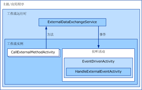 工作流實例上的 HandleExternalEventActivity 和 CallExternalMethodActivity 活動與在自定義接口中聲明并在自定義本地服務中實現的事件和方法交互。 HandleExternalEventActivity 活動響應由主機應用程序引發且由本地服務實現的特定事件。 CallExternalMethodActivity 對本地服務調用方法。
