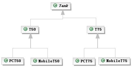 其中Tank是一個抽象基類,其中假設有Shoot(),Move(),Stop(),Turn()方法,分別表示射擊、移動、停住、轉彎,而T50和T75是兩個型號的坦克,都繼承于Tank,它們將實現具體的方法。但我們是要有PC和Mobile兩個平臺的,于是又有了PC版的T50:PCT50,PC版的T50:MobileT50,T75也一樣,有兩個平臺。