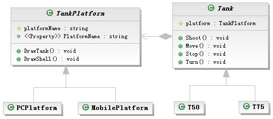 如上圖,TankPlatform描述平臺, 它有一個屬性PlatformName,指平臺名稱,在PCPlatform和MobilePlatform的構造方法中將初始化這個值,它的DrawTank()和DrawShell()方法表示了不同平臺上繪制坦克和炮彈的方法,PCPlatform和MobilePlatform繼承TankPlatform,表示PC平臺和Mobile平臺。Tank有一個TankPlatform類型的protected字段platform,它表示坦克所運行的平臺,T50和T75繼承于Tank。