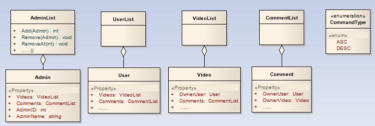 上圖中的User類、Video類等中擁有數(shù)據庫中對應表的所有字段(數(shù)據庫中有Admin、User、Video、VideoSort、Comment表),我沒有畫出來,在User類中,有Videos和Comments屬性,表示某用戶上傳的視頻列表和發(fā)表的所有評論列表,其它類中也有類似的屬性。