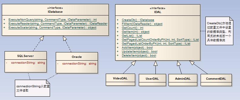 說明:IDatabase是一個接口,定義了一些執(zhí)行SQL語句或存儲過程的方法,上圖中只標出了三個,SQLServer和Oracle是兩個具體的數(shù)據庫,實現(xiàn)IDatabase接口,IDAL是一個表示對Video、User、Admin、Comment進行管理的接口,其中的CreateDb()方法從配置文件中讀取數(shù)據庫類型,然后利用反射創(chuàng)建該具體數(shù)據庫(SQLServer類或Oracle類)并返回,其它方法全部都利用CreateDb()返回的數(shù)據庫類來執(zhí)行相應的Sql語句或存儲過程,其中GetCount()是返回該對象的總數(shù)量(如Video的總數(shù)、User的總數(shù)),GetItem(int id)通過該對象的id(在數(shù)據庫中是主鍵)返回對象(比如VideoDAL中的GetItem(int id)就通過數(shù)據庫中video的ID返回Video對象),GetList就是返回對象列表(如VideoList,UserList),GetPagedListOrderByPK(int startRow, int maxRows, SortType sortType)也是返回一個列表,但它是分頁時當前頁應該顯示的那部分對象列表,startRow和maxRows是該頁的起始行號和取出的最大記錄數(shù)(可以認為是page size),方法體中是與數(shù)據庫交互,取出數(shù)據,SortType是一個枚舉,有ASC和DESC兩值,代表排序規(guī)則,結果是按主鍵排序的。