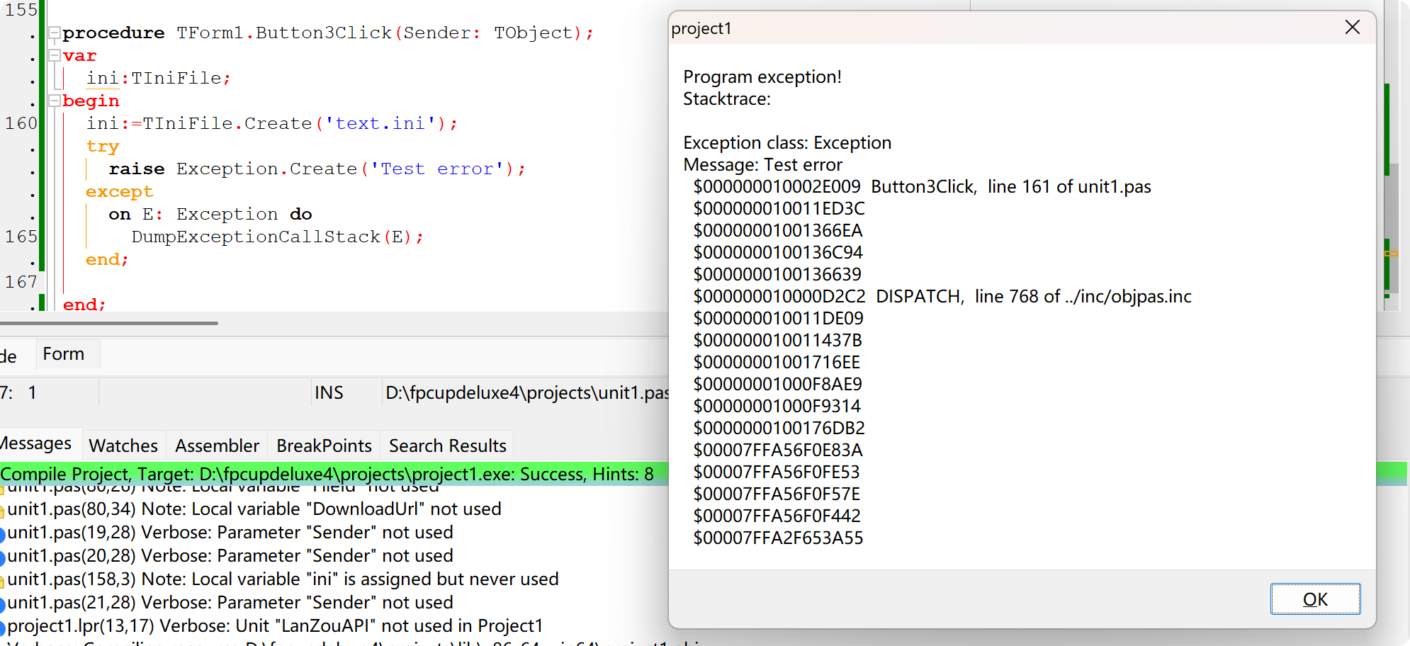 procedure TForm1.Button4Click(Sender: TObject); begin try raise Exception.Create('Test error'); except on E: Exception do DumpExceptionCallStack(E); end; end;
