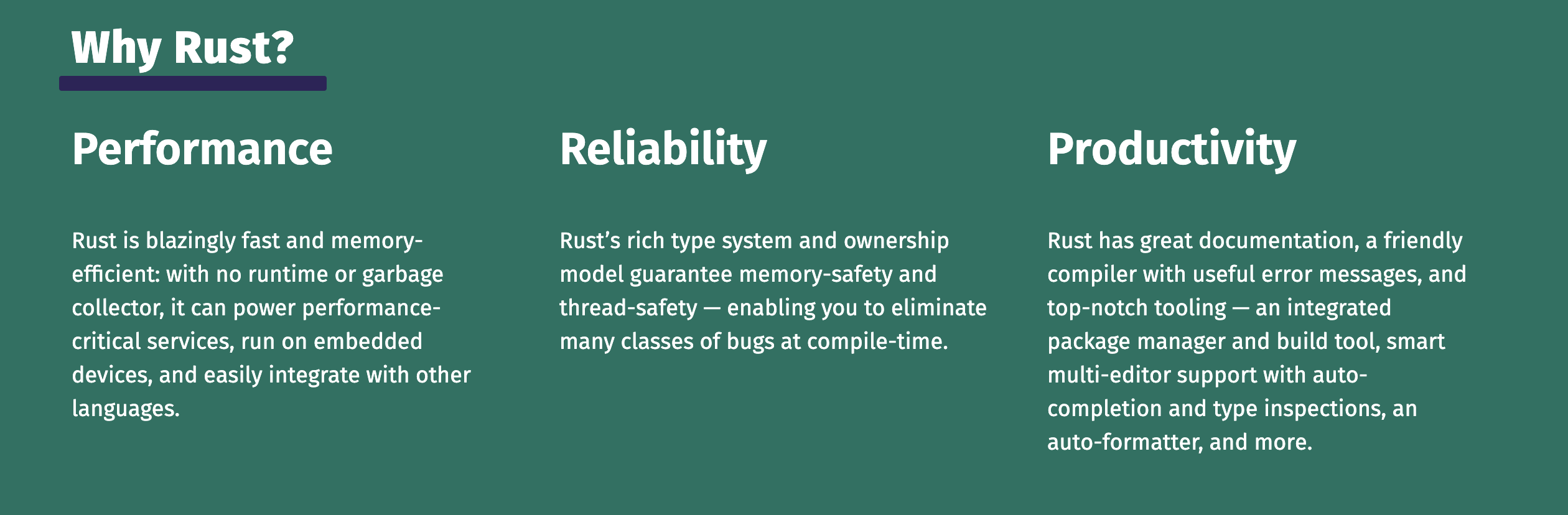 在 rust 官網(wǎng):https://www.rust-lang.org/ ,有這樣一句醒目的話: