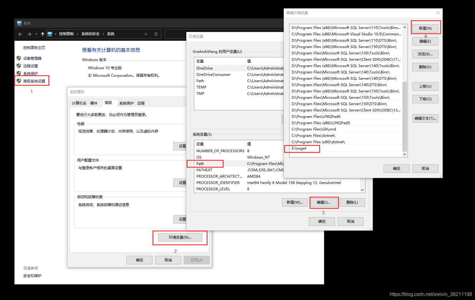 打開電腦屬性--高級系統設置--環境變量--系統變量,選擇Path--編輯--新建--填寫E:\nuget,確定
