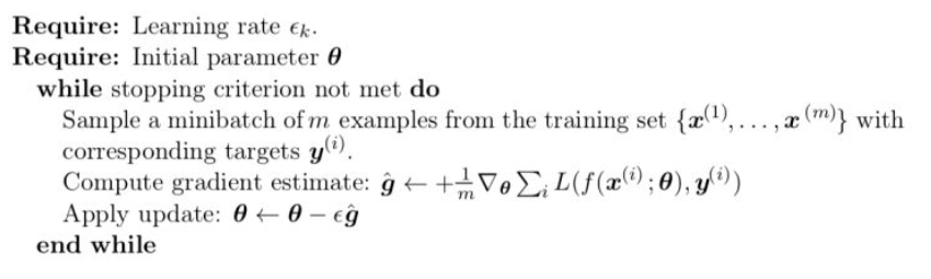 注意到,我們引入了另一個超參數學習率 \(\epsilon_k\) ,可以說學習率是深度學習中最重要的需要調節的參數,如果學習率過大,我們可能會一次就跳過極小點而到山谷的另一側,那么訓練的loss可能會有較大波動而不是一致的向極小點步進,另一方面,如果學習率過小,訓練更新過小,需要較長時間才能達到較好效果。通常我們需要經過不斷的試驗來選取合適的學習率,另外也可以在初始時使用稍大一些的學習率,隨著訓練的進行可以逐步的降低學習率從而避免波動,例如通常采用的方法是對于前 \(\tau\) 次iteration, 線性的降低學習率 \(\epsilon_k=\left(1-\frac{k}{\tau}\right) \epsilon_0+\frac{k}{\tau} \epsilon_\tau\),之后保持學習率恒定。