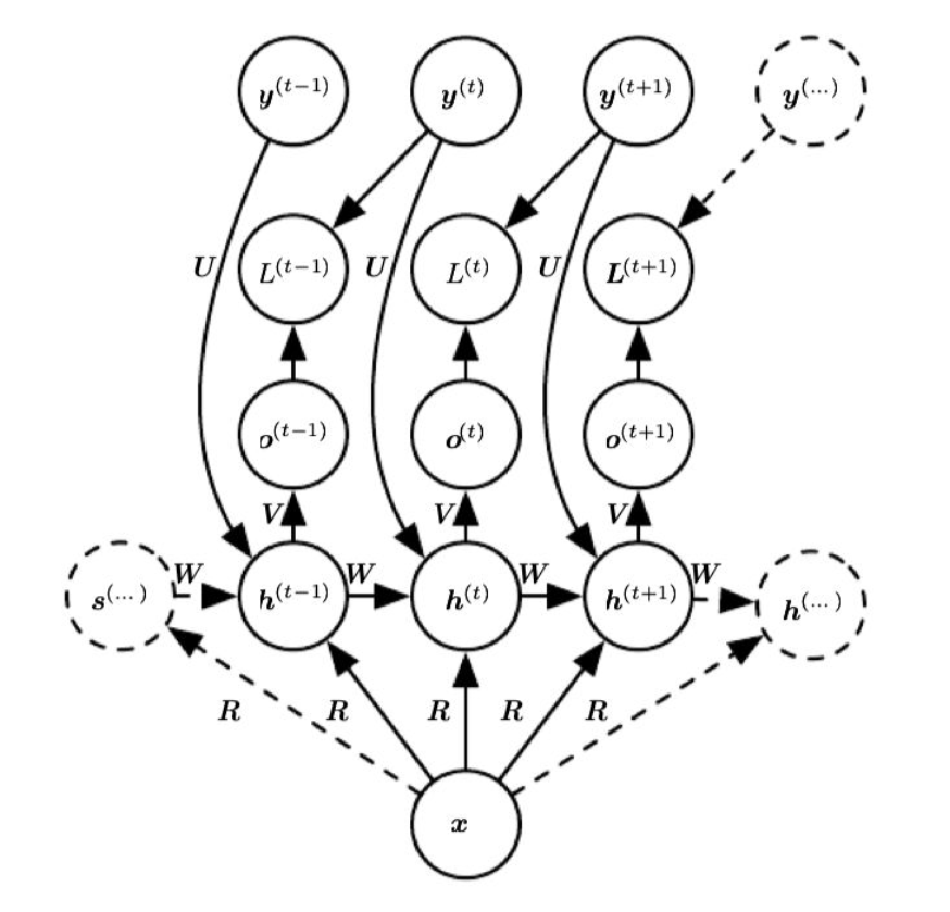 即在每一個時間點都產生輸出,并且hidden units之間有循環鏈接,圖中 \(y\) 為該點的真實目標 值, \(L\) 為模型預測的輸出值 \(O\) 與真實值 \(y\) 間的損失函數如交叉熵,總的損失為各 \(L^{(t)}\) 之和。由 于該結構hidden units之間有循環鏈接,計算時我們需要順序計算,而不能進行并行計算,所以訓練過程較為緩慢。而且該模型需要輸入與輸出序列長度相同。