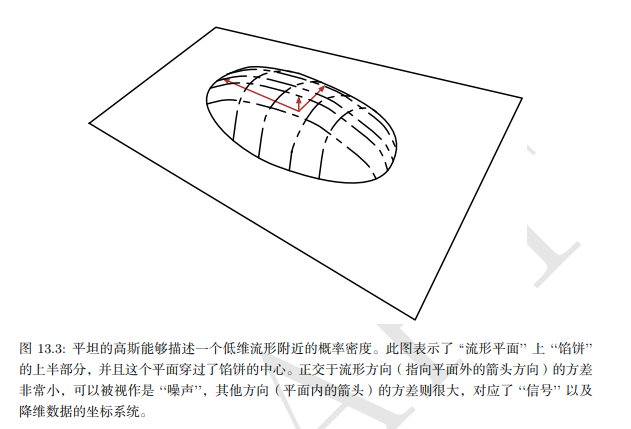線性因子模型, 包括 PCA 和因子分析, 可以理解為學(xué)習(xí)一個(gè)流形。CA 定義為高概率的薄餅狀區(qū)域, 即一個(gè)高斯分布, 沿著 某些軸非常窄, 就像薄餅沿著其垂直軸非常平坦, 但沿著其他軸是細(xì)長(zhǎng)的, 正如薄餅在其水平軸方向是很寬的一樣。4PCA 可以理解為將該薄餅與更高維空間中的線性流形對(duì)準(zhǔn)。這種解釋不僅適用于傳統(tǒng)PCA, 而且適用于學(xué) 習(xí)矩陣 \(W\) 和 \(V\) 的任何線性自編碼器, 其目的是使重構(gòu)的 \(x\) 盡可能接近于原始的 \(x_0\) 。